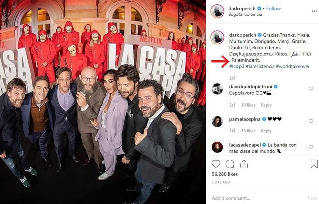 Peric ka publikuar në profilin e tij në Instagram një fotografi bashkë me kastin e serialit dhe ka falenderuar në disa gjuhë të ndryshme.