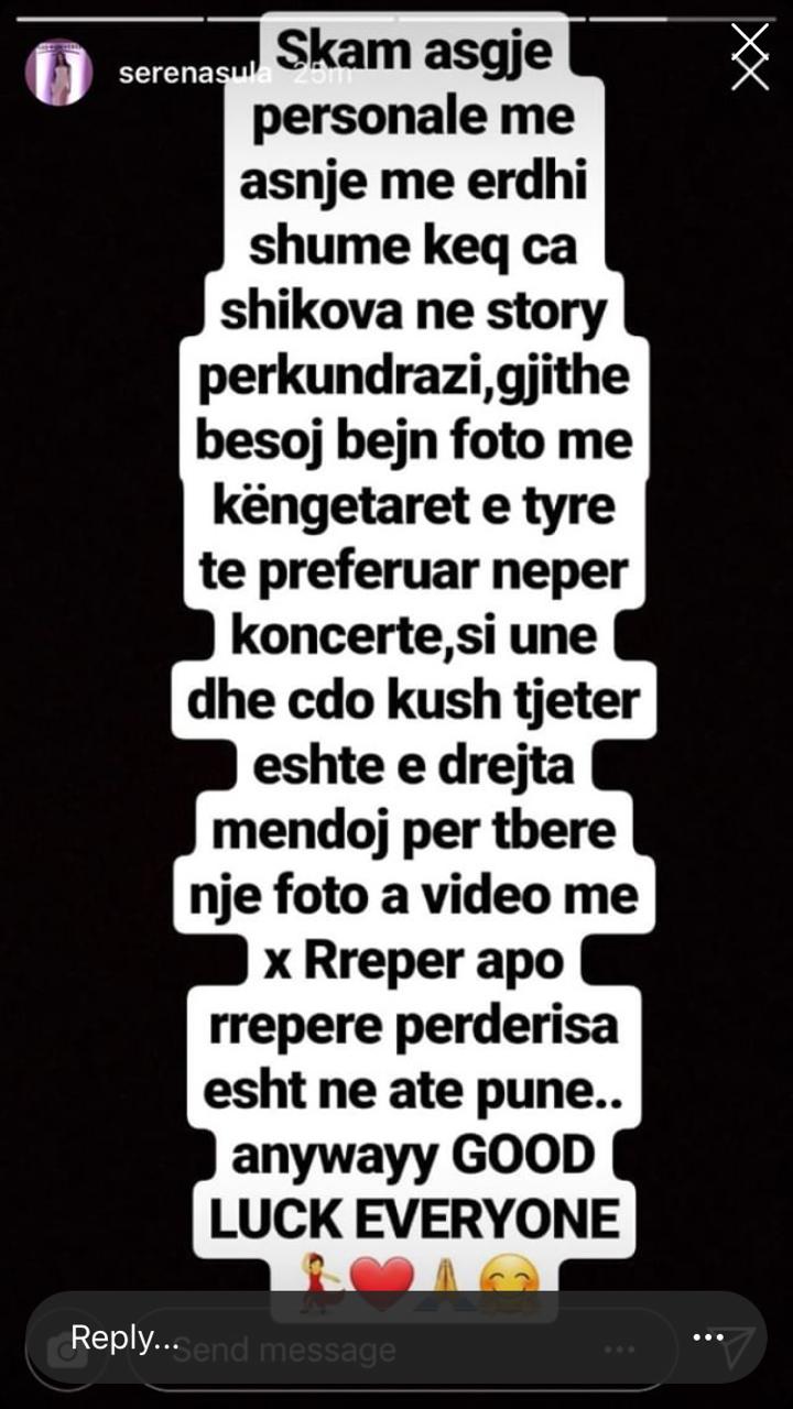 “Mendoj se çdokush ka të drejtë të bëjë një foto apo video me reperin e saj të preferuar. S’ka pse të xhelozojë apo kërcënojë.”- shprehet Serena në një postim të publikuar në instastory.