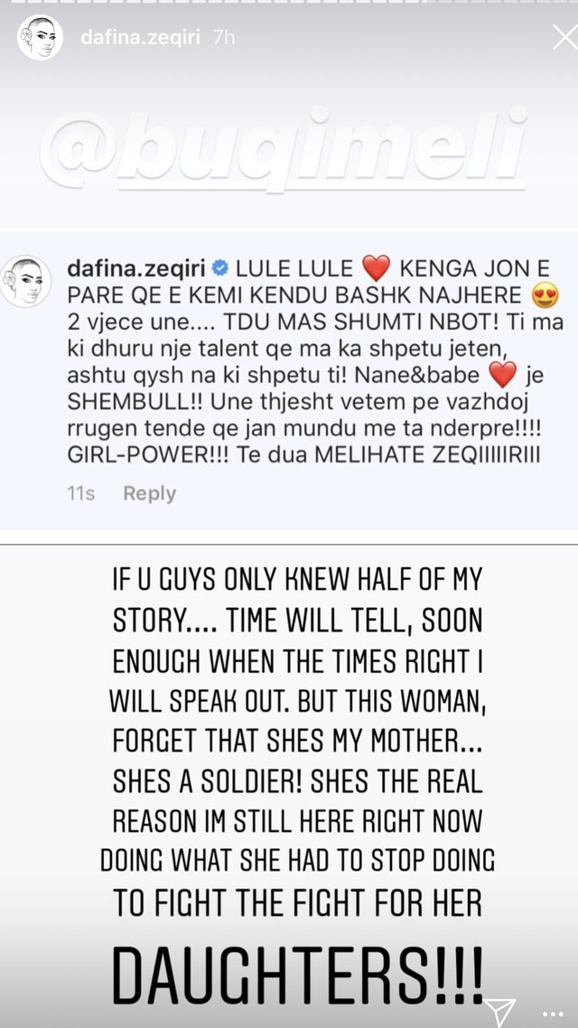 “Ah sikur ju ta dinit jetën time…koha do ta tregojë, kur të vij momenti do të flas. Por kjo grua, përtej faktit që është mamaja ime është një luftëtare! Është arsyeja se përse jam duke bërë këtë që po bëj të cilën ajo duhet të ndalonte së bëri për të luftuar për vajzat e saj!” përfundon këngëtarja.