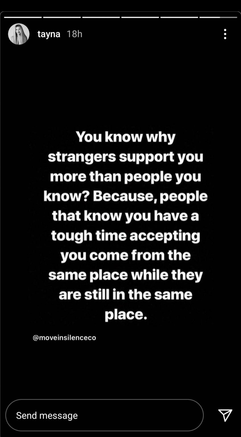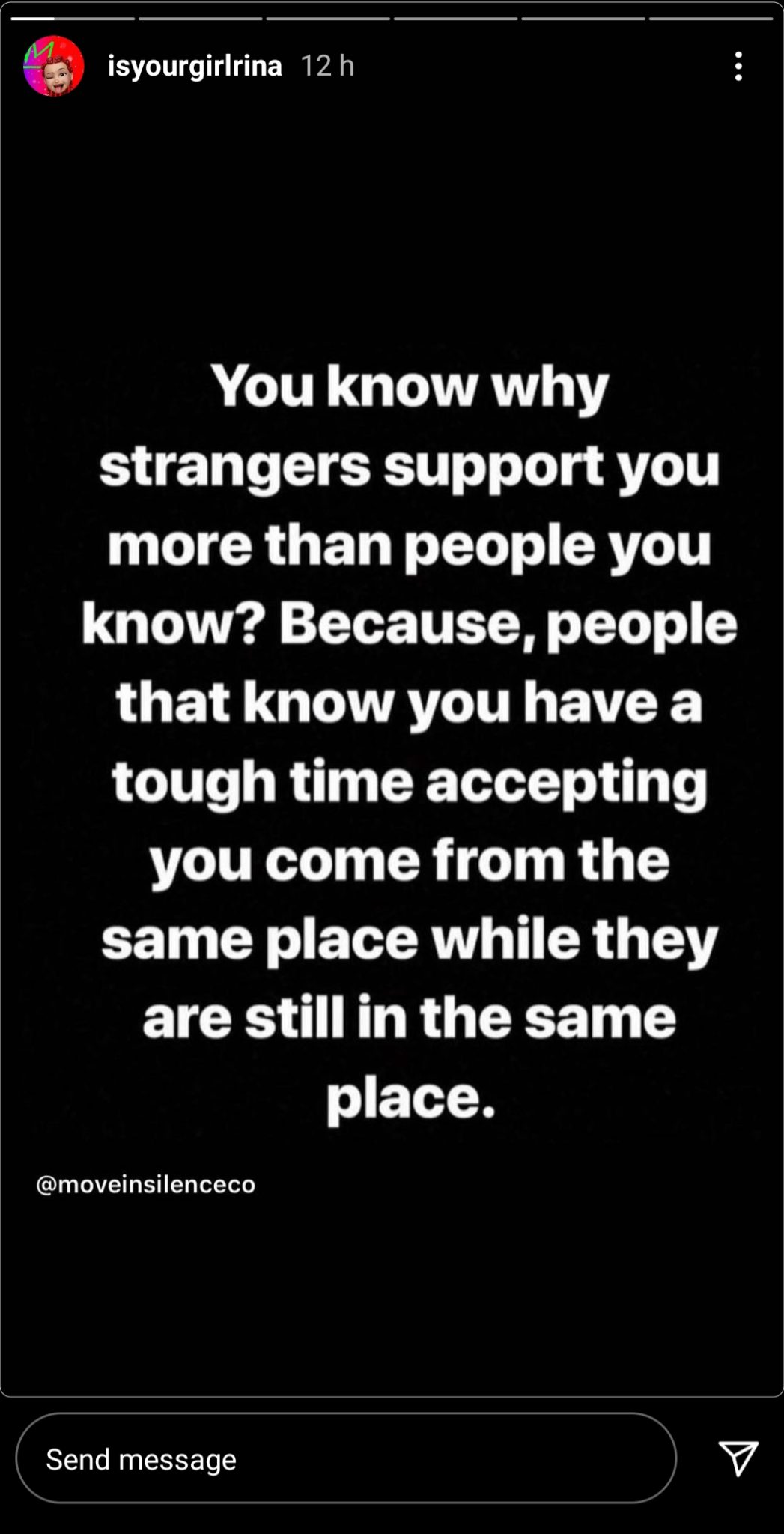 Por, gjithçka duket se ka ndryshuar. Dy të shtuna më parë në “Shiko Kush LUAN”, Rina la të kuptohej se jo vetëm që nuk ka më inate mes saj dhe Tayna-s, por me shumë mundësi mund të shohim edhe një bashkëpunim mes tyre. Postimet e fundit të vajzave në rrjetet sociale gjithsesi kanë tërhequr menjëherë vëmendjen e fansave. Kjo, pasi të dyja reperet kanë publikuar të njejtën frazë: “E dini pse të huajt ju mbështesin më shumë se njerëzit që njihni? Sepse e kanë të vështirë ta pranojnë se vijnë nga i njejti vend si ti, me dallimin që ata kanë mbetur në të njejtin vend.”