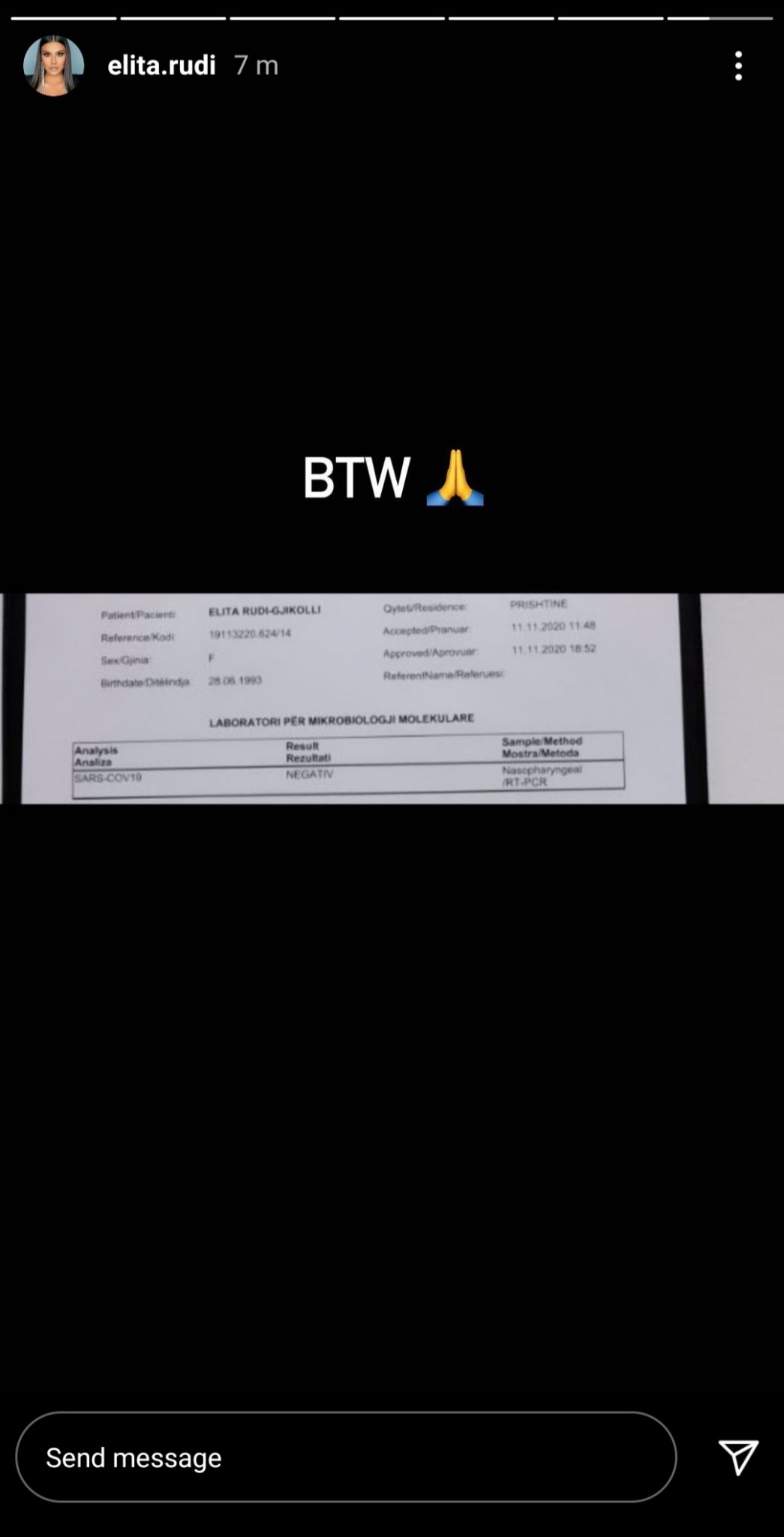 Së fundmi, Elita Rudi i është nënshtruar tamponit. Fatmirësisht ajo ka rezultuar negative dhe e ka ndarë rezultatin e testit me ndjekësit e saj në Instastory. Nga dokumenti i publikuar prej saj shohim se e ka kryer testin 4 ditë më parë, më 11 nëntor, por e ndau me ne vetëm ditën e sotme.