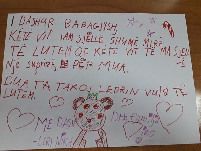 ‘I dashur Babagjysh, këtë vit jam sjellë shumë mirë. Të lutem që këtë vit të sjellësh një surprizë për mua‘, shkruan vogëlushja duke marrë me të mirë Babagjyshin. Më pas ajo shkruan se dëshiron të takojë Ledrin, duke e mbushur foton me zemra e vizatime.