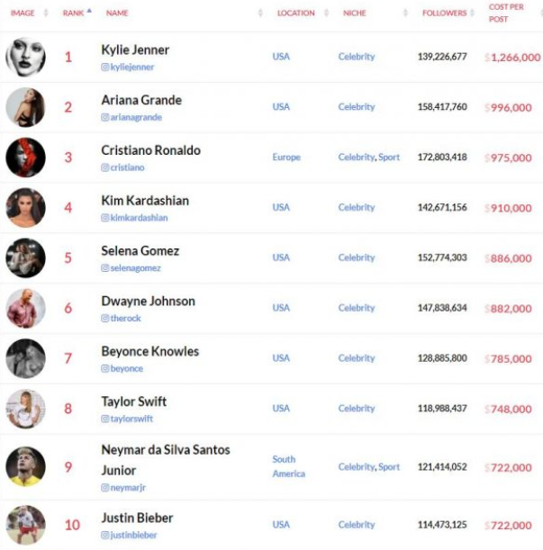Pastaj vijnë edhe emra të njohur si Ariana Grande, Cristiano Ronaldo, Kim Kardashian, Selena Gomez, Dwayne Johnson, Beyonce, Taylor Swift, Neymar dhe Justin Bieber të cilët e përbëjnë top 10-shen.