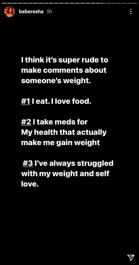 “Mendoj se është shumë pasjellshme të komentosh për peshën e dikujt. Unë ha, e dua ushqimin Marr ilaçe për shëndetin tim dhe ato më bëjnë të shtoj peshë. Gjithmonë kam pasur probleme me peshën time dhe dashurinë ndaj vetes”, i është përgjigjur Rexha.