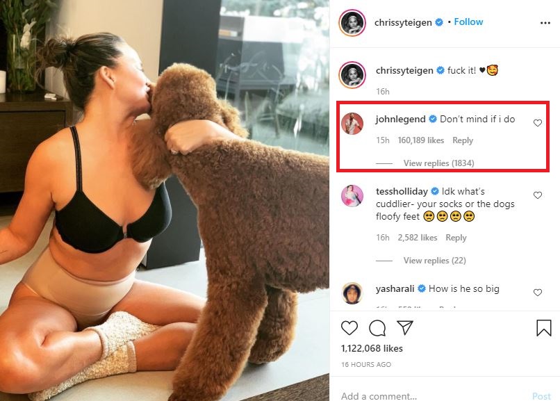 Së fundmi, modelja ka ndarë në llogarinë e saj në Instagram një foto shumë seksi ku shfaqet me të brendshme, ndërsa krahas saj shkruan: “Fuck it“. Gjithçka në rregull, deri në momentin që shohim komentin epik të John Legend, i cili s’i ka rezistuar dot pozës së partneres së tij.