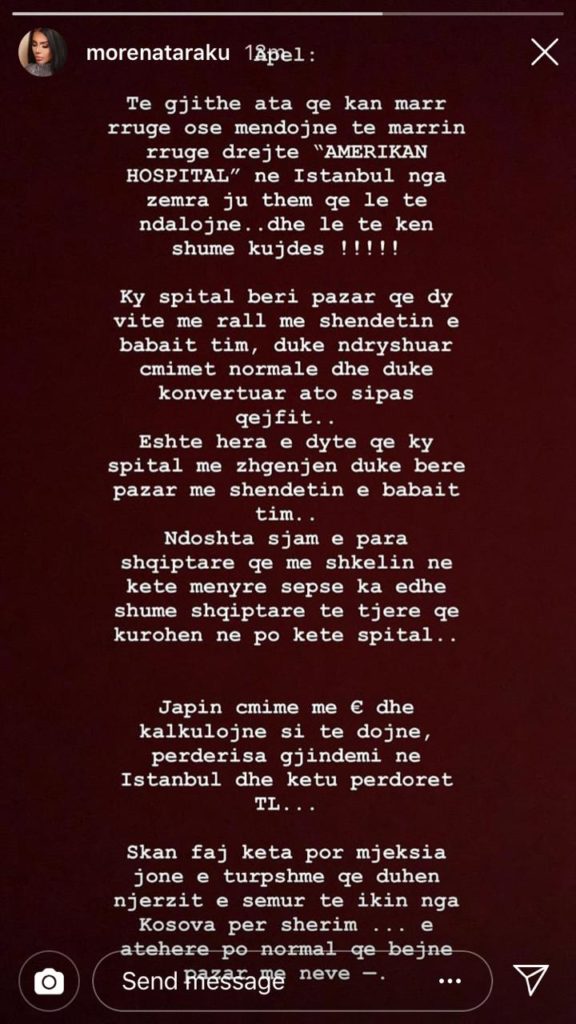 “Ky spital bëri pazar për dy vite me radhë me shëndetin e babait tim, duke ndryshuar çmimet normale dhe duke i konvertuar ato sipas qejfit. Është hera e dytë që ky spital më zhgënjen duke bërë pazar me shëndetin e babait tim. Ndoshta s’jam e para shqiptare që më shkelin në këtë mënyrë, sepse ka dhe shumë shqiptarë të tjerë që kurohen në këtë spital. Japin çmime në euro dhe i kalkulojnë si të duan, përderisa gjendemi në Stamboll dhe këtu përdoret lira turke. S’kanë faj këta, por mjekësia jonë e turpshme që duhet njerëzit e sëmurë të ikin nga Kosova për shërim… e atëherë normal që bëjnë pazar me ne”, shkruhet në postimin e saj në Insta Story.