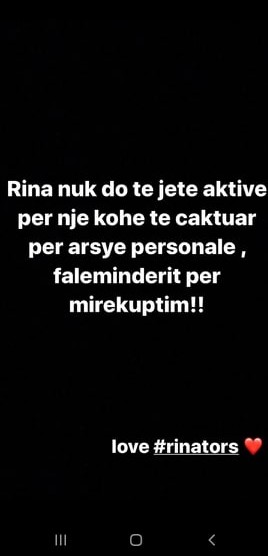 “Rina nuk do te jete aktive per nje kohe te caktuar per arsye personale, faleminderit per mirekuptim!!”, ka shkruar ajo në postim.
