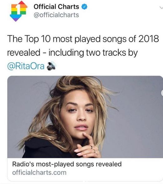 Së fundi Rita ka arritur një tjetër sukses, sipas ‘Official Charts’ 28 vjeçarja është këngëtarja e katërt më e dëgjuar në botë me dy këngë të përfshira në këtë radhitje.
