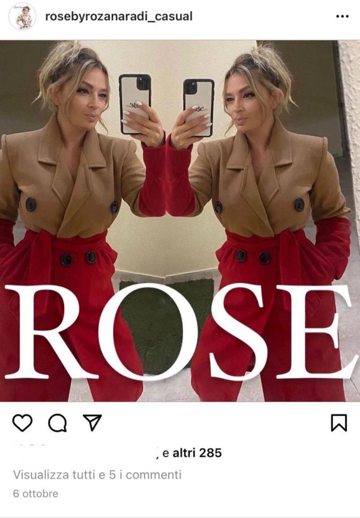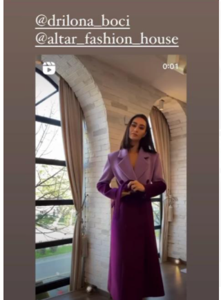 Në datën 6 tetor është publikuar kjo foto në Instagram-in e biznesit të aktores, ku duket palltoja me dy ngjyra e veshur nga vetë ajo, një krijim i “Rose by Rozana Radi”: