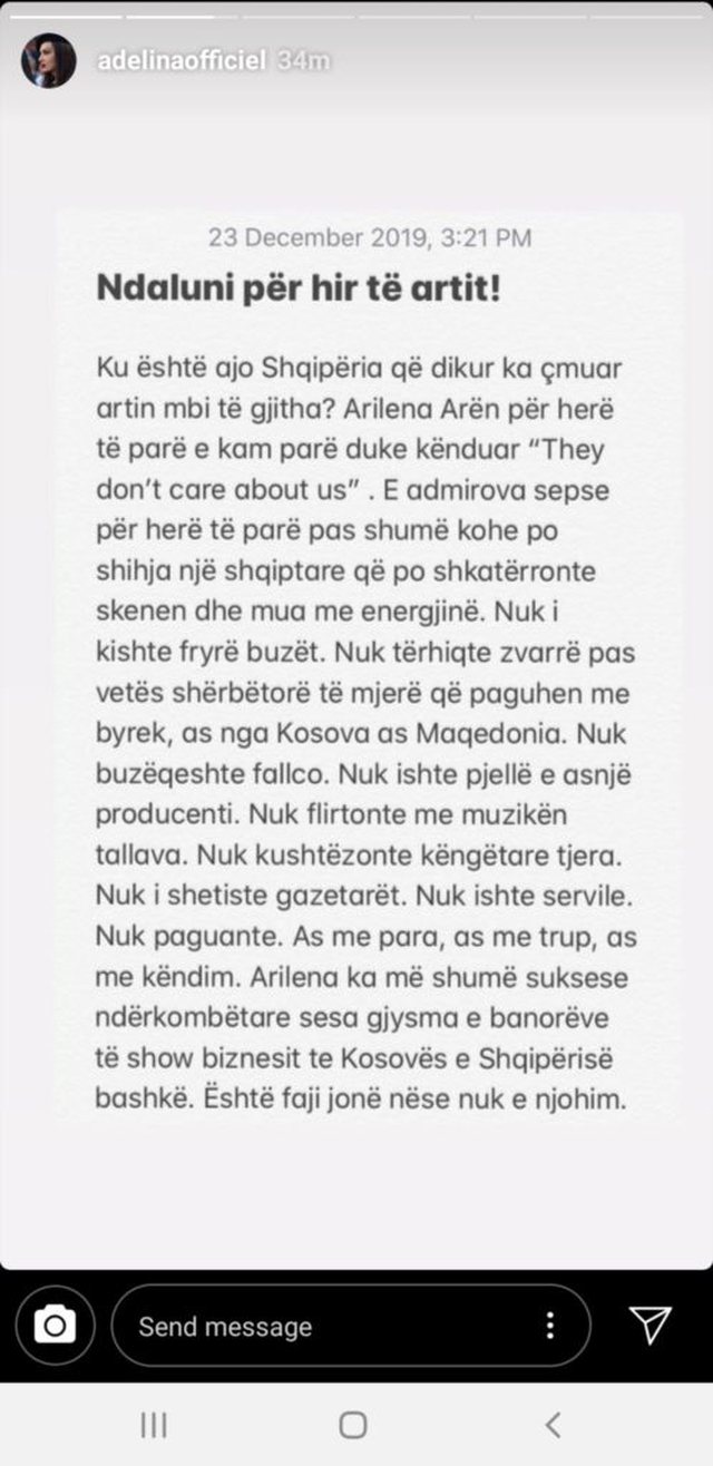 “Ku është ajo Shqipëria që dikur ka çmuar artin? Arilena Arën për herë të parë e kam parë duke kënduar “They don’t care about us”. E admirova sepse për herë të parë pas kaq shumë kohësh po shihja një shqiptare që shkatërronte skenën dhe mua bashkë me energjinë e saj. Nuk kishte buzë të bëra, nuk buzëqeshte zvarrë. Nuk ishte servile. Nuk i shëtiste gazetarët. Nuk i paguante. As me trup, e as me para, e as me këndim”, shprehet Adelina për Arilenën.