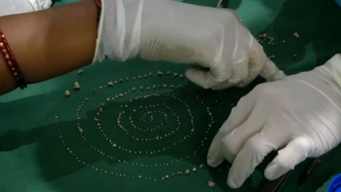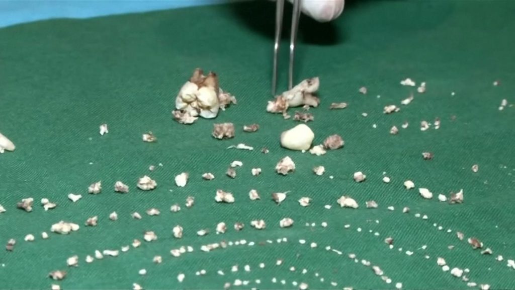 Pas katër vitesh ankesa, mjekët në Chennai zbuluan një rritje të madhe brenda nofullës së tij. Qindra struktura të forta u gjetën brenda gungës, e cila ishte me madhësi rreth 3 deri në 5 centimetra.