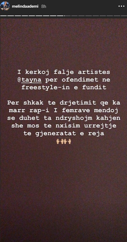 “I kërkoj falje artistes Tayna për ofendimet në Freestyle-in e fundit. Për shkak të drejtimit që ka marrë repi i femrave mendoj se duhet të ndryshojmë kahjen dhe mos të nxisim urrejtje të gjeneratat e reja”, ka thënë ajo por njësoj nuk ka vepruar edhe Tayna.