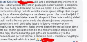 Pas kësaj, ka reaguar Teuta ku ka thënë se unë do vazhdoj të i shikoj punët e mia, ndjej shume dashni dhe rrespekt për gjithë ata qe i shohin gjerat me mendje dhe zemer te hapur ashtu sic jane dhe ndjej shume keqardhje per gjithe ata qe mllefin e tyre dhe pamundesine per vetrealizim, e shprehin duke u mundu te zvogelojne punen dhe perkushtimin e tjetrit.